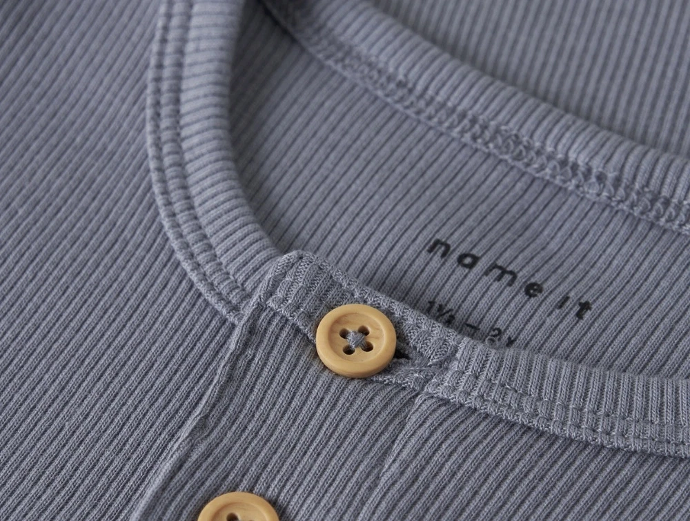 Ribbluse i blågrå nuance fra Name It. En klassisk langærmet bluse i blød, strækbar rib med rund hals og to træknapper foran, der giver et afslappet og tidløst look.