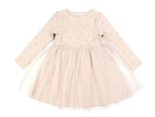 Kjole i ribkvalitet i farven rose smoke med tylskørt og glitterhjerter fra Name It.