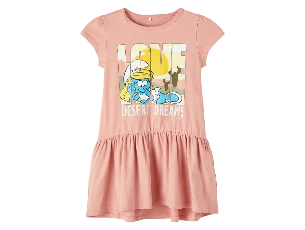 Denne kjole fra Name It i farven rose tan med Smølferne-print er en sød og farverig kjole til dit barn.
