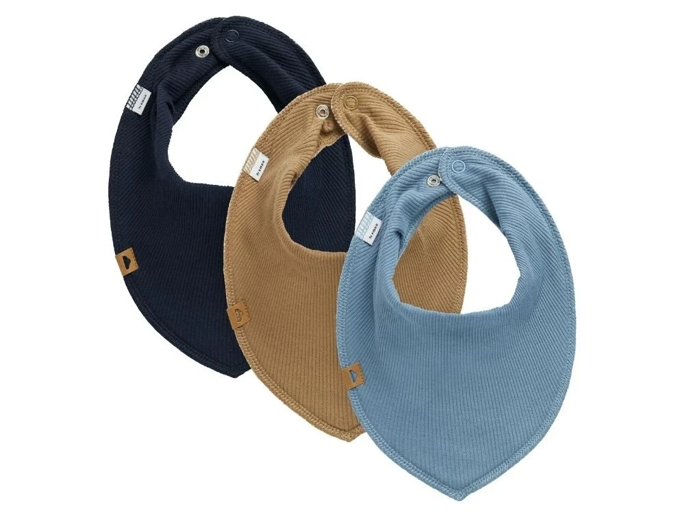 Bløde og praktiske hagesmække i en ribstrikket kvalitet med en bagside af fleece, der hjælper med at holde barnets tøj tørt. Sættet indeholder tre savlesmække i blå og brune nuancer.