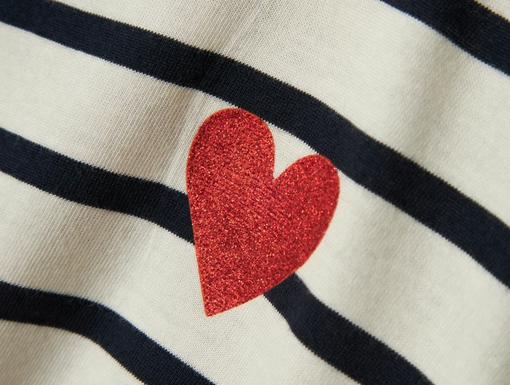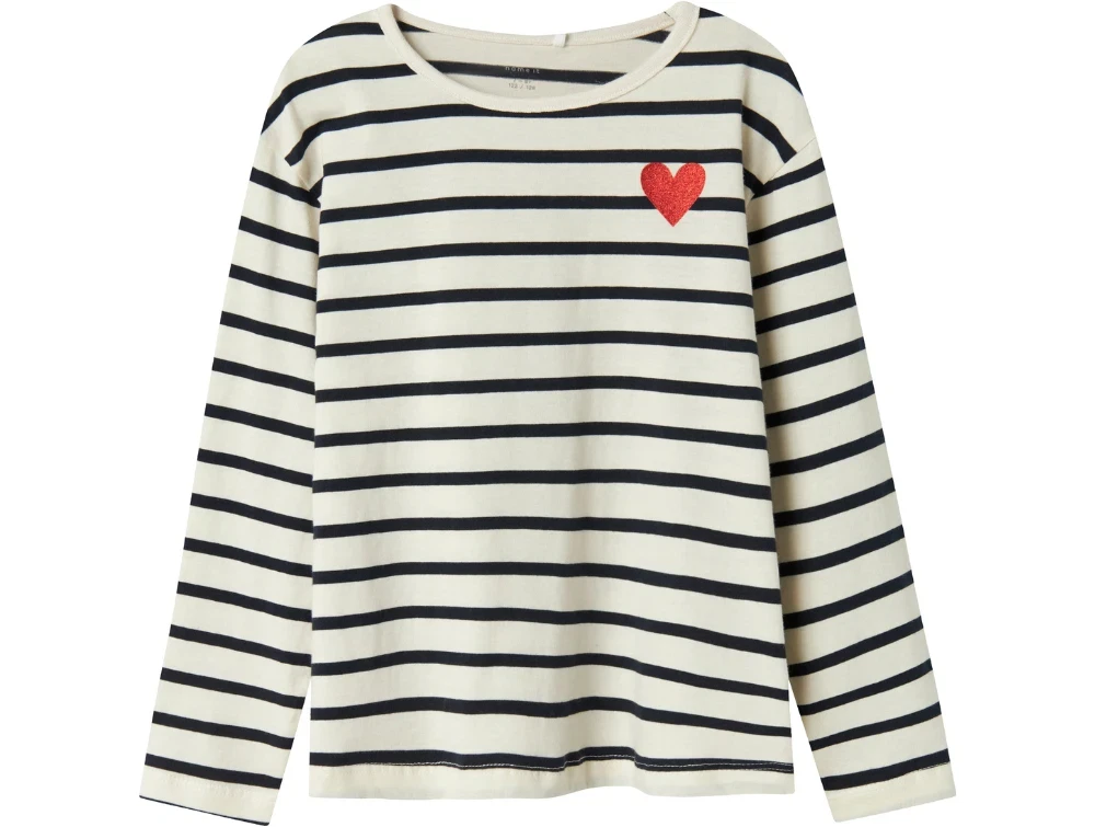 Langærmet t-shirt i farven sea salt med striber og glitterhjerte fra Name It.