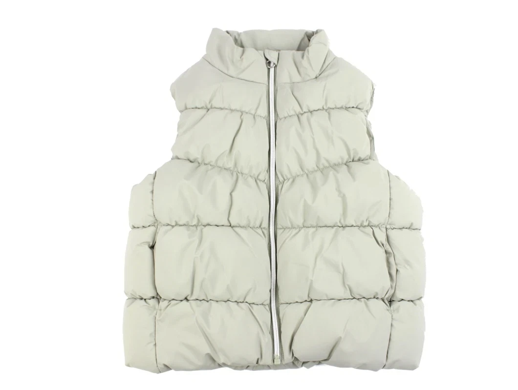 Vesten har to skrålommer og lukkes med sølvfarvet lynlås.