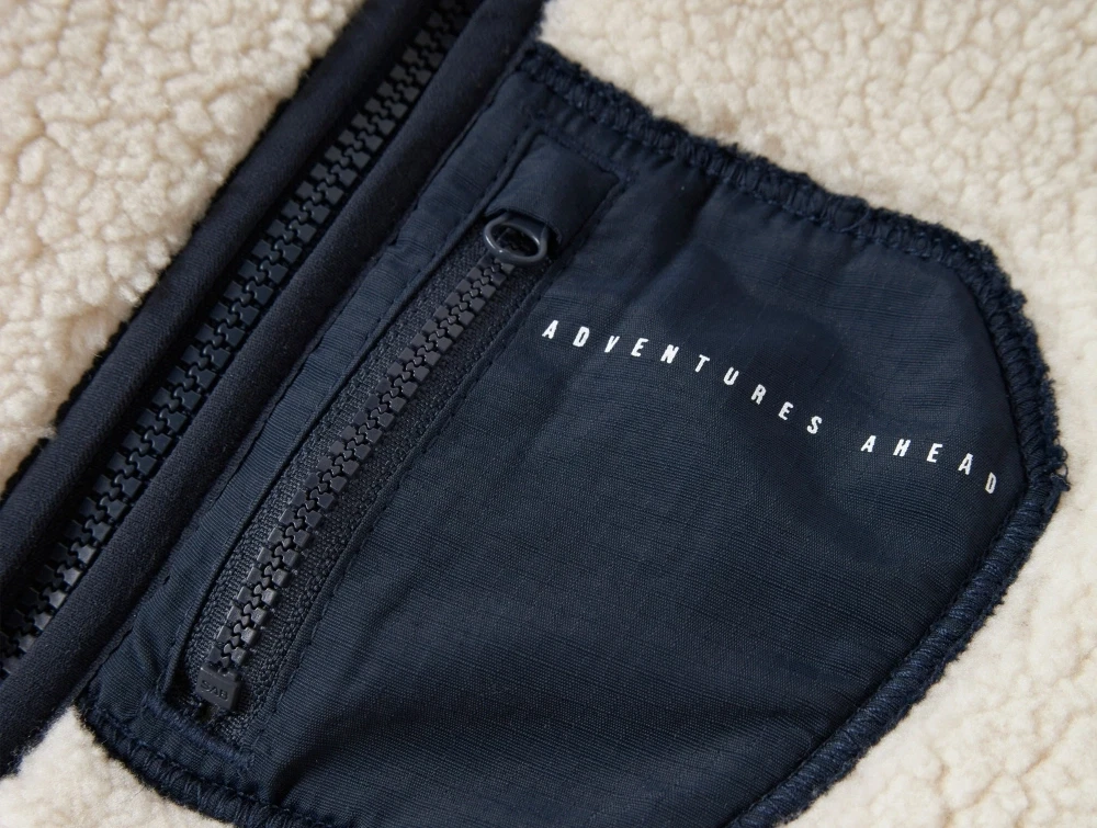 Jakken har høj hals, lange ærmer med dropped shoulders og er designet med lynlåslukning foran. Den har to sidelommer samt en brystlomme i kontrastfarve med lynlås og printet teksten "Adventures Ahead". Foran er lynlåsen udstyret med hagebeskytter. Jakken er en smule længere bagpå for ekstra komfort.