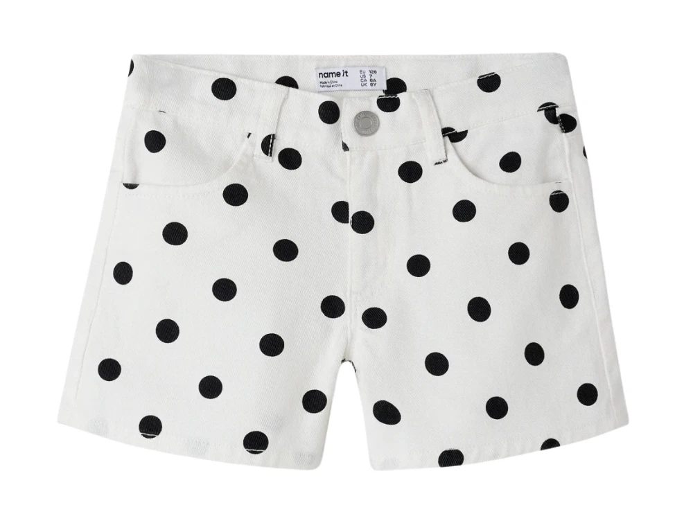 Shorts i råhvid nuance (antique white) fra Name It med sorte prikker.