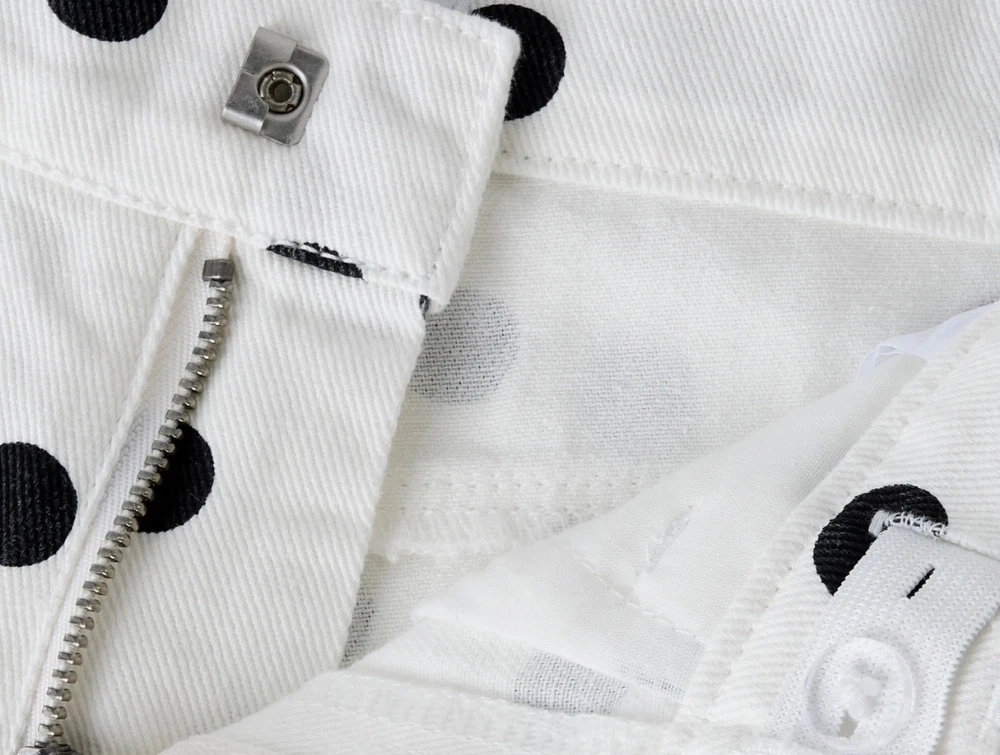 Designet har klassiske for- og baglommer, lynlåslukning og knaplukning foran samt et prikket print over hele overfladen. Shortsene har almindelig pasform og et rent udtryk med små slidte detaljer i overfladen.
