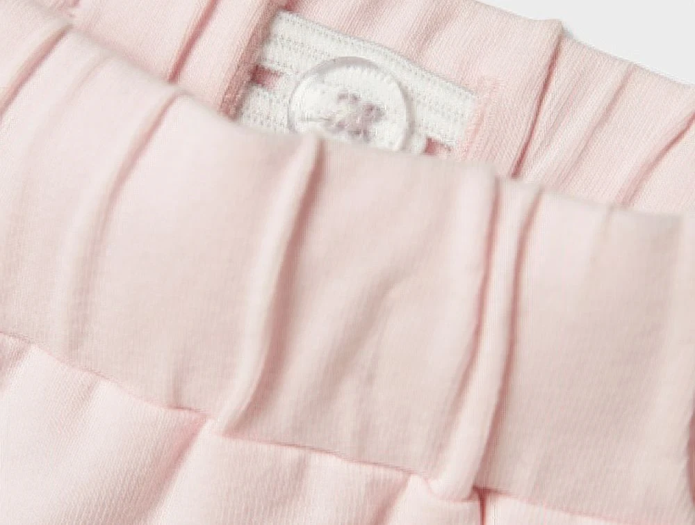 Lyserøde shorts fra Name It med Paw Patrol print foranNærbillede af justerbar elastik i taljen på lyserøde shorts