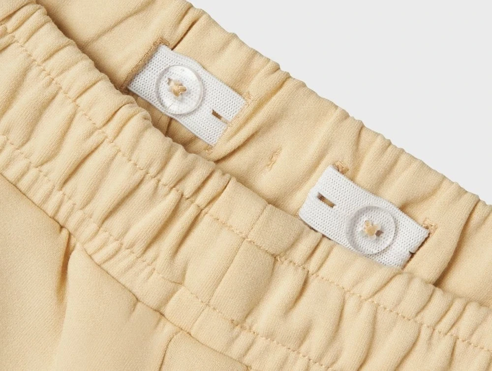 name it shorts i beige med broderet tekstprint og snøre, set forfraname it shorts i beige med elastik og uden print, set bagfranærbillede af justerbar elastik i taljen på name it shorts i beigebarn iført name it shorts i beige med tekstbroderi, set i miljø