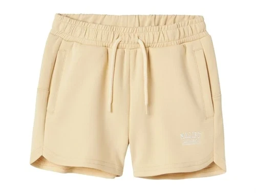 Shorts i beige sweatkvalitet fra Name It med broderet tekstprint og afrundede benkanter – en casual style til sommergarderoben.