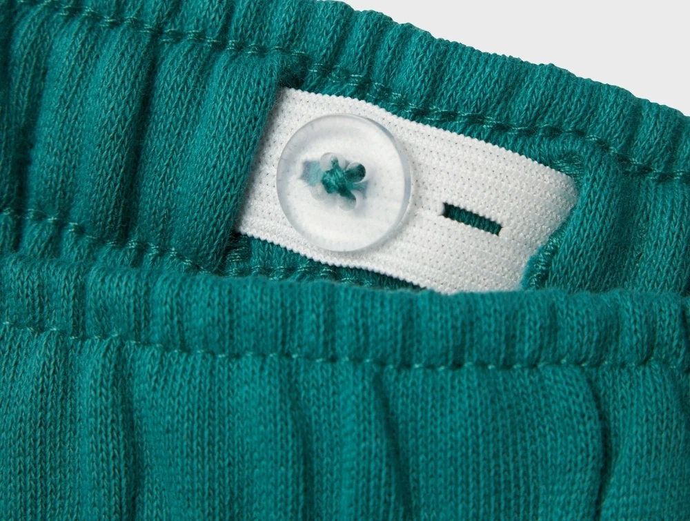 Shorts i grøn nuance (deep jungle) fra Name It. Modellen har et lille tigerbroderi og justerbar talje med bindebånd.