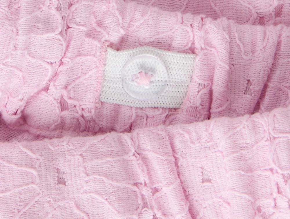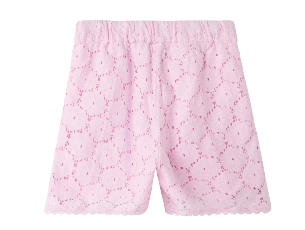 Name It shorts i lyserød nuance med broderie anglaiseName It shorts pirouette med hulmønsterName It shorts pirouette detalje af broderie anglaise stof