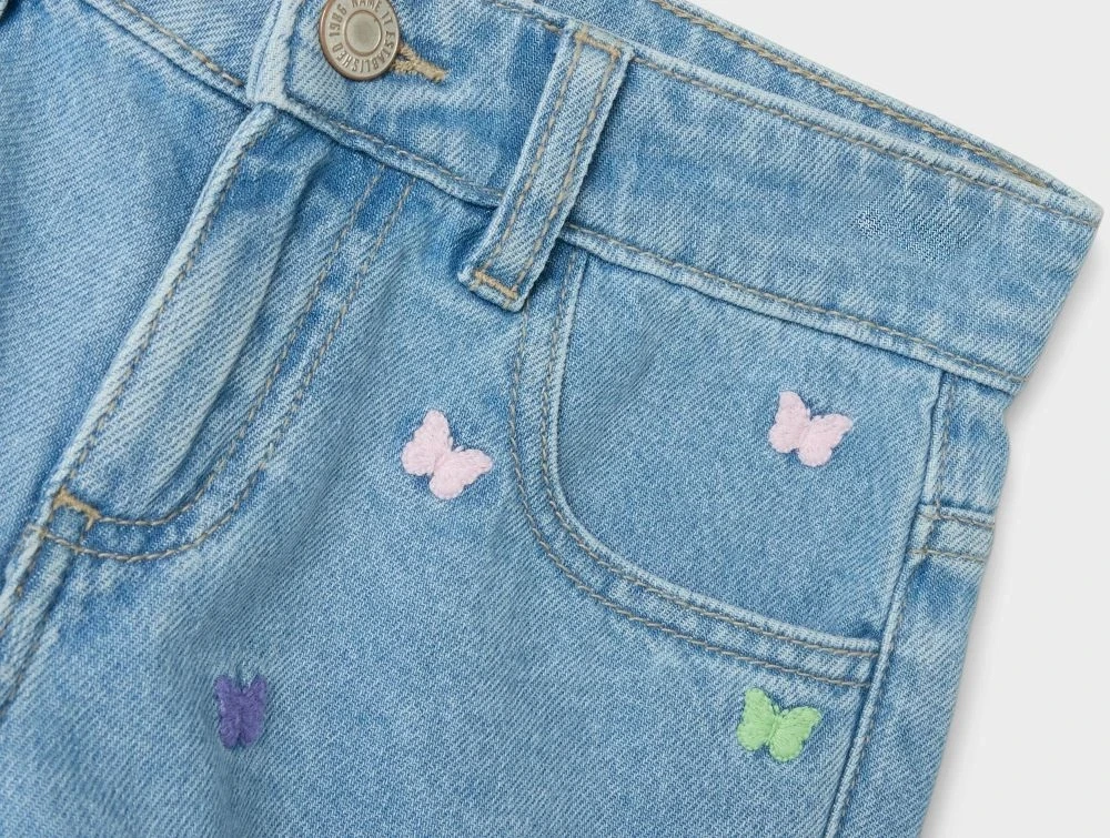 Søde denimshorts fra Name It i en lys blå vask med fine sommerfuglebroderier. Shortsene er lavet i en blanding af almindelig og økologisk bomuld, hvilket giver en blød og behagelig kvalitet.