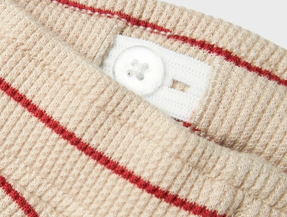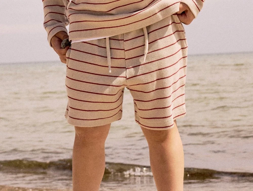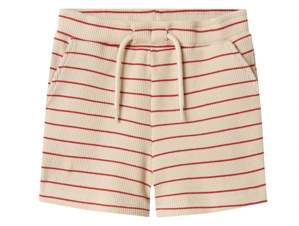 Bløde og behagelige shorts fra Name It i waffel kvalitet i en beige nuance med et klassisk rødt smalstribet mønster. Shortsene har en regulær pasform og er lavet i en bomuld med en struktureret overflade, der giver et let og sommerligt udtryk.