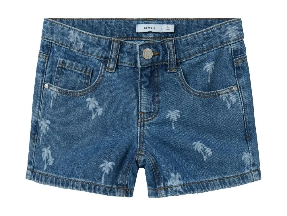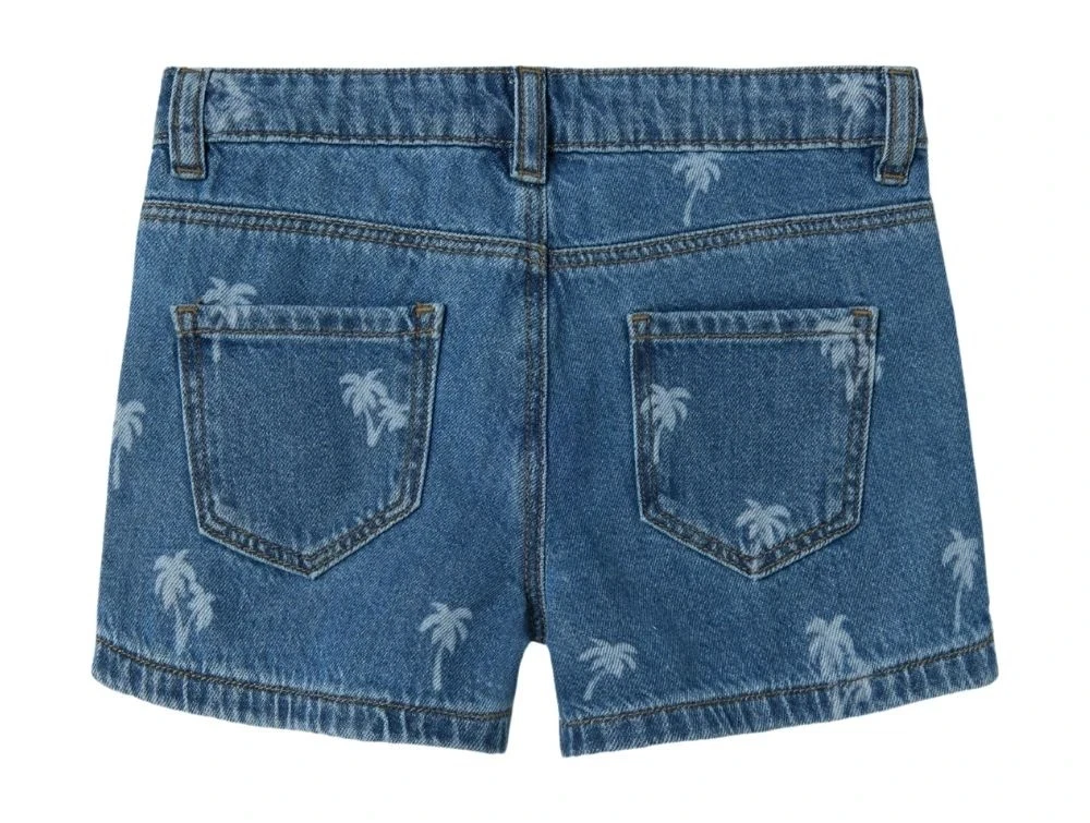 Denimshorts i mellem blå fra Name It med præget palmetræ-print – en sjov og sommerlig style med klassisk jeans-look.