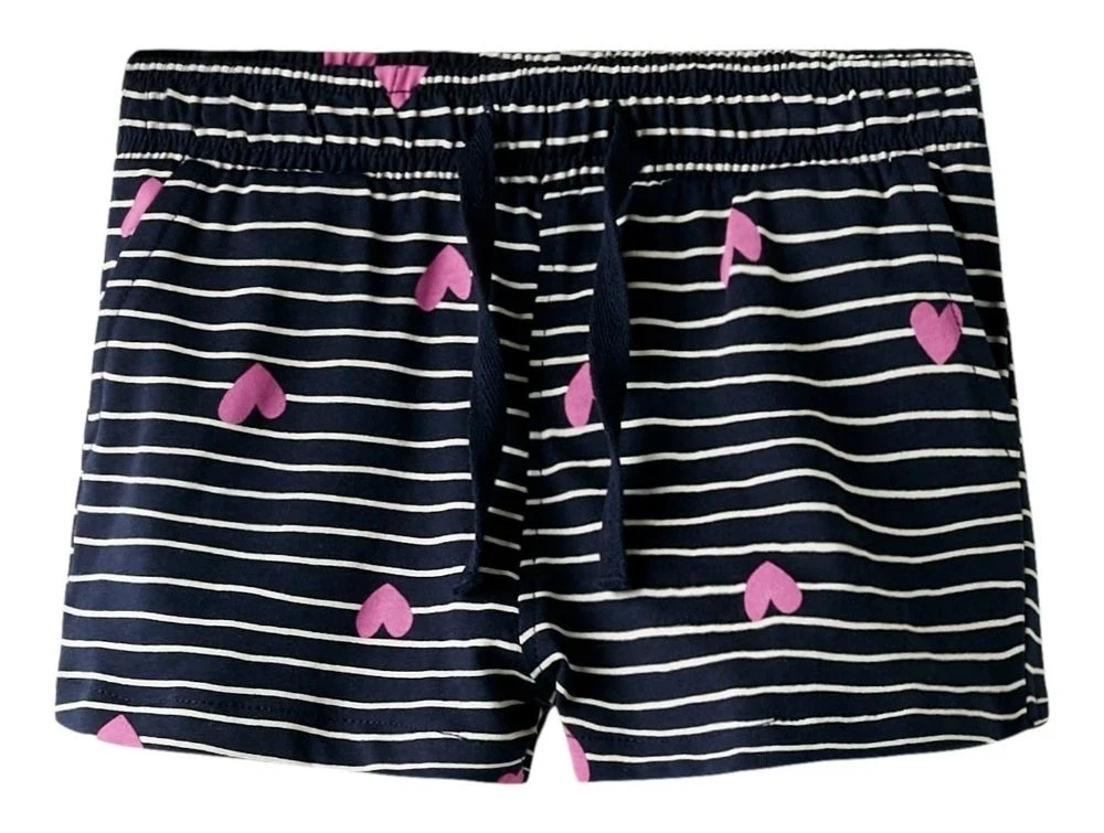 Søde og sommerlige shorts fra Name It i en klassisk mørkeblå farve med hvide, smalle striber og små pink hjerter. Shortsene er lavet i blød og let jersey, som giver en behagelig pasform og god bevægelsesfrihed.