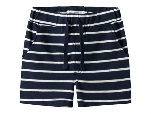 Shorts i mørkeblå fra Name It med hvide horisontale striber og justerbar bindesnor i taljen.