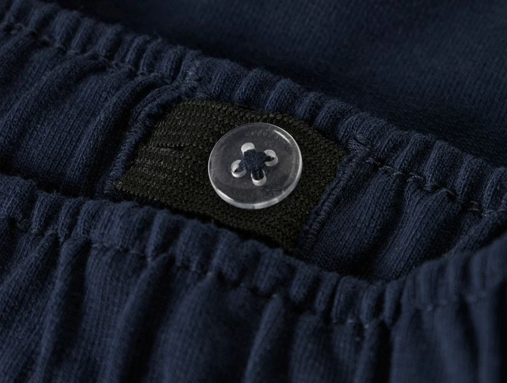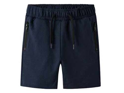 name it shorts i mørkeblå med sorte lynlåslommer, set forfranærbillede af justerbar elastik i mørkeblå name it shorts