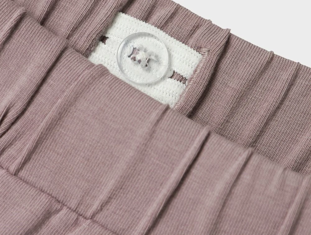 Lilla shorts fra Name It med Paw Patrol print foranNærbillede af justerbar elastik i taljen på lilla shorts