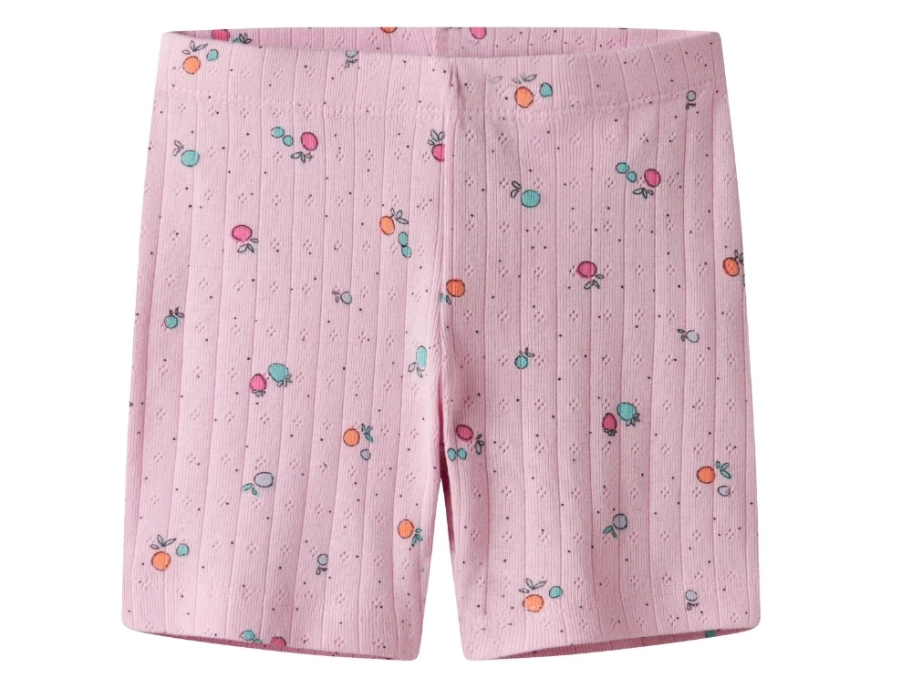 Shorts i lyserød nuance (sweet dreams) fra Name It med et sødt frugtprint og pointelle hulmønster i stoffet.