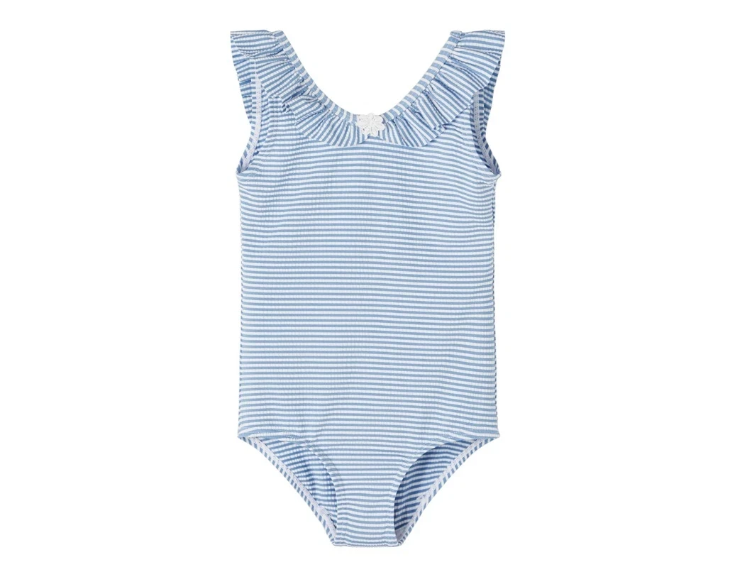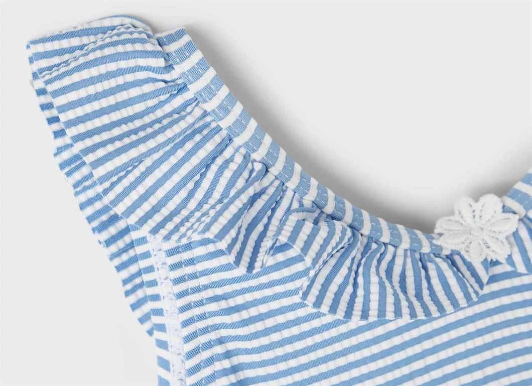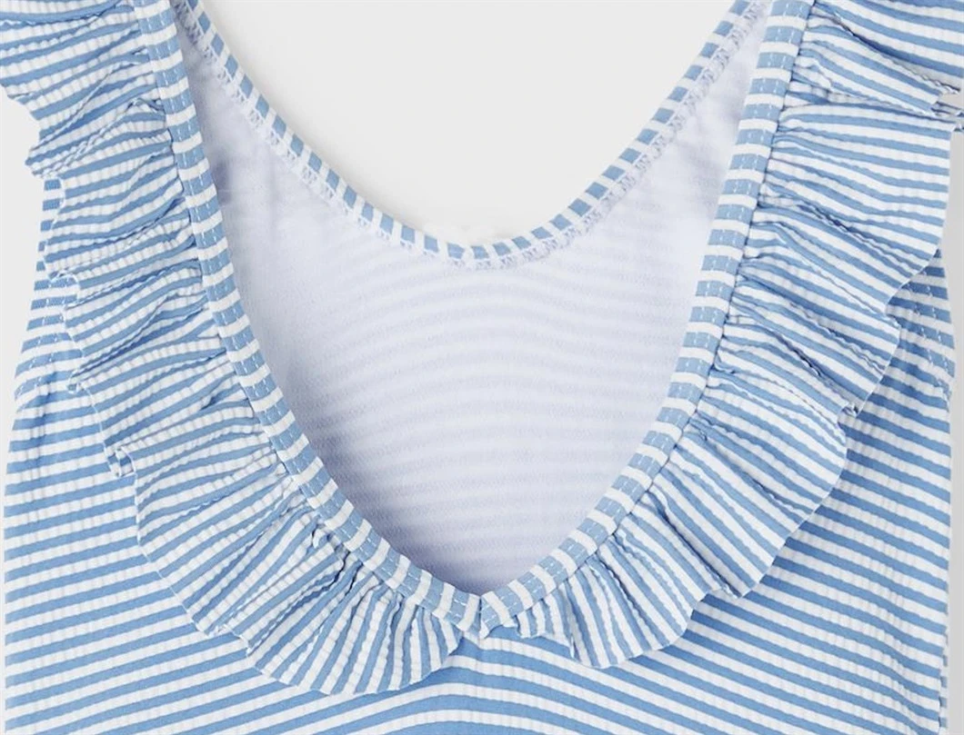 Badedragten kommer i farven silver lake blue med flotte striber, feminine flæser og en lille sløjfe som en ekstra fin detalje.
