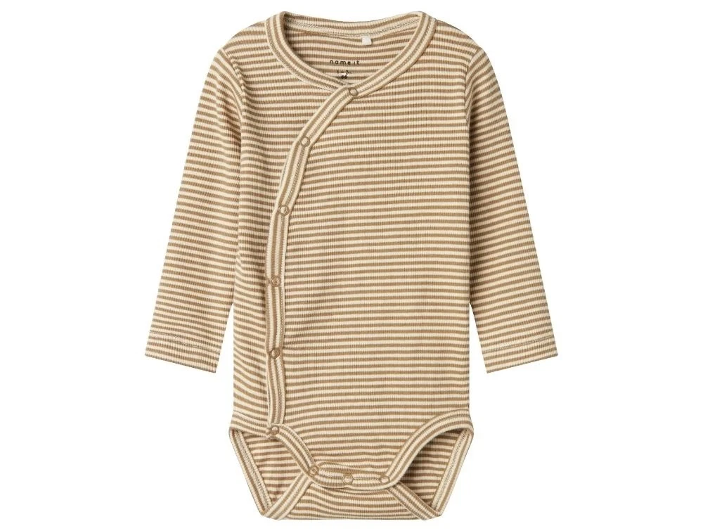 Blød og praktisk langærmet slå om-body fra Name It i en klassisk stribet kombination af råhvid og brun. Bodyen er fremstillet i en strækbar ribkvalitet, der sikrer en behagelig pasform og god bevægelsesfrihed.