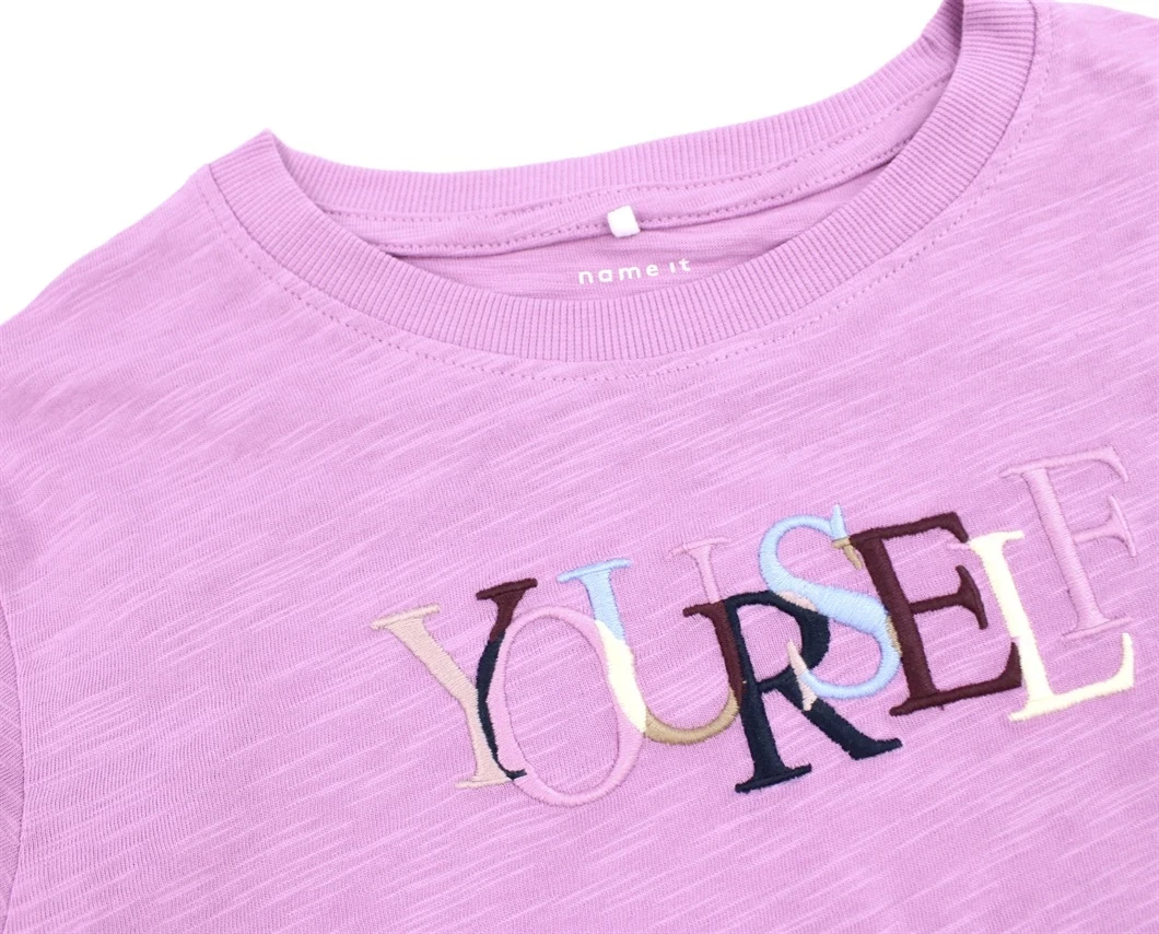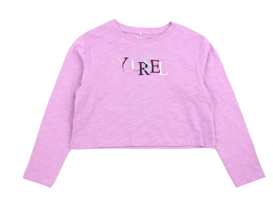 Name It crop top i farven smoky grape med applikation med teksten 'YOURSELF'.
