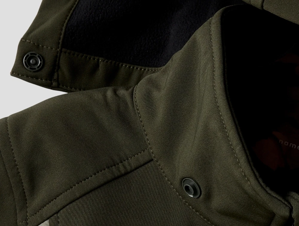 Name It softshell jakke i dusty olive set forfra  Name It softshell jakke i dusty olive set bagfraDetalje af aftagelig hætte på Name It softshell jakke i dusty olive Refleksdetalje på Name It softshell jakke i dusty olive