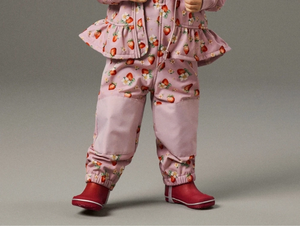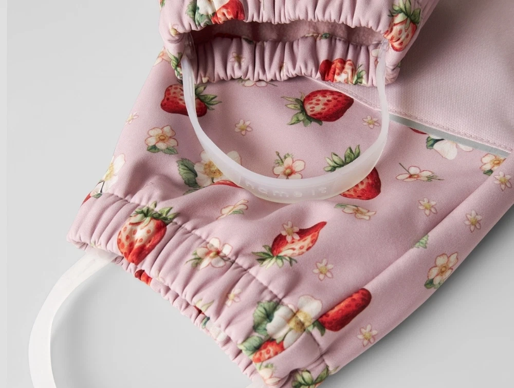 Name It softshellbukser i rosa nuance med jordbærprint på barnName It softshellbukser i rosa nuance med jordbærprintName It softshellbukser med justerbare seler og lynlåsName It softshellbukser med elastik ved ben og fodstropName It softshellbukser set bagfra i rosa nuance
