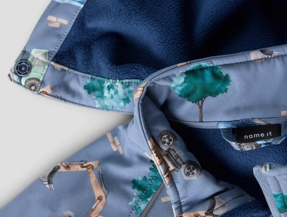 Name It softshelljakke i blå nuance med arbejdsbilprint på barnName It softshelljakke i blå nuance med arbejdsbilprintName It softshelljakke med fleecefor og lynlåsvagtName It softshelljakke med arbejdsbilprint i blå nuanceName It softshelljakke set bagfra i blå nuance