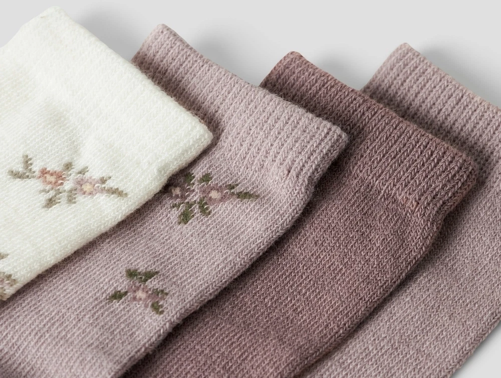 Name It sokker 4-pak i støvet rosa og shadow gray med blomsterprint i merinould mixName It sokker 4-pak i støvet rosa og shadow gray med blomsterdetaljer i merinould mix tæt
