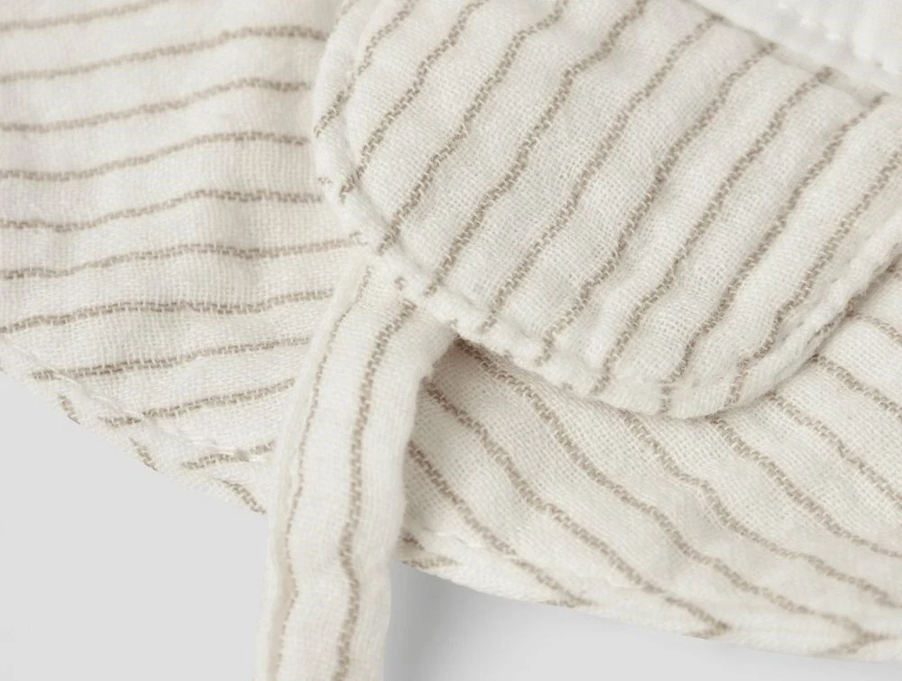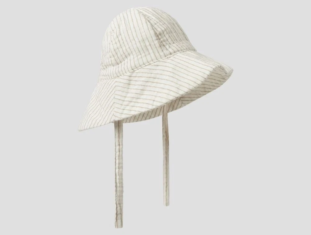 Solhat til baby med striber i vævet bomuld og med bindebånd