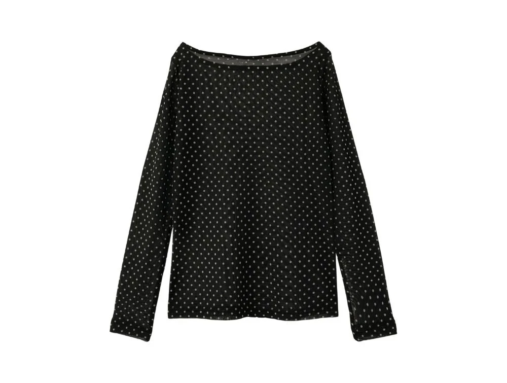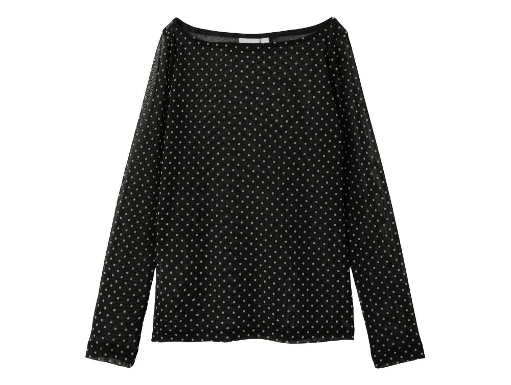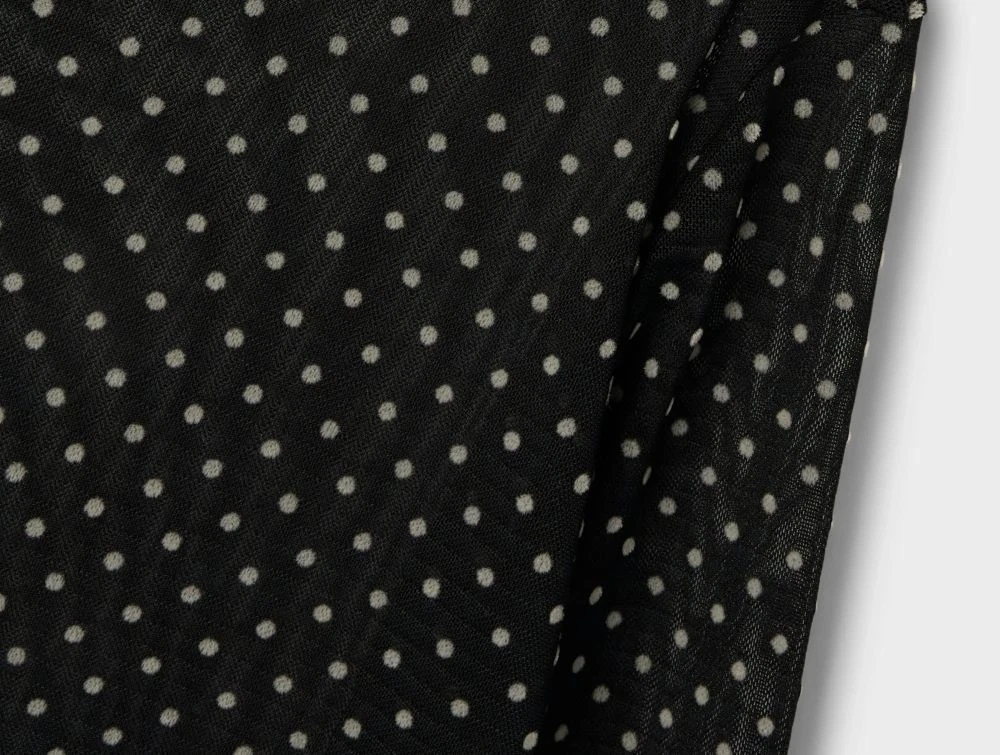 Toppen har rund hals og en tætsiddende pasform. Det strækbare meshstof er let og åndbart, og printet med prikker dækker hele toppen og skaber et enkelt, men iøjnefaldende look.