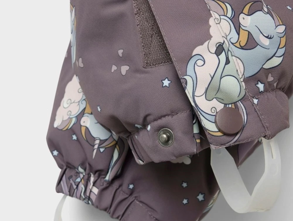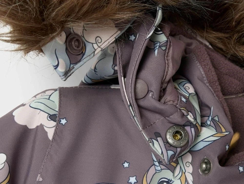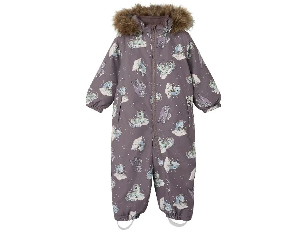 Flyverdragt i farven sparrow med enhjørning-print fra Name It. Flyverdragten har en aftagelig hætte med faux fur og trykknapper.