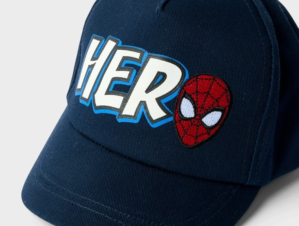 Modellen har en klassisk buet skygge og broderet Spiderman detalje samt stort HERO print, der giver et tydeligt superhelteudtryk.