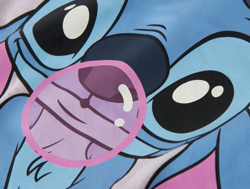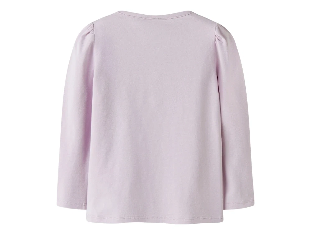 Pige iklædt Name It bluse lavender fog med Stitch motivName It bluse lavender fog med Stitch motivDetaljebillede af print på Name It bluse lavender fog med Stitch motivName It bluse lavender fog bagfra