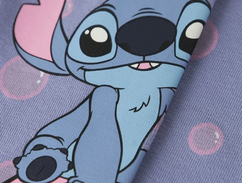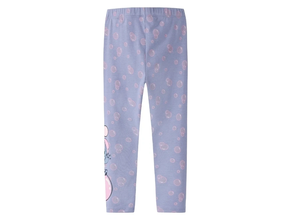 Leggings i lilla nuance (Lavender Fog) fra Name It med motiv af Disney-figuren Stitch og små bobler i printet.
