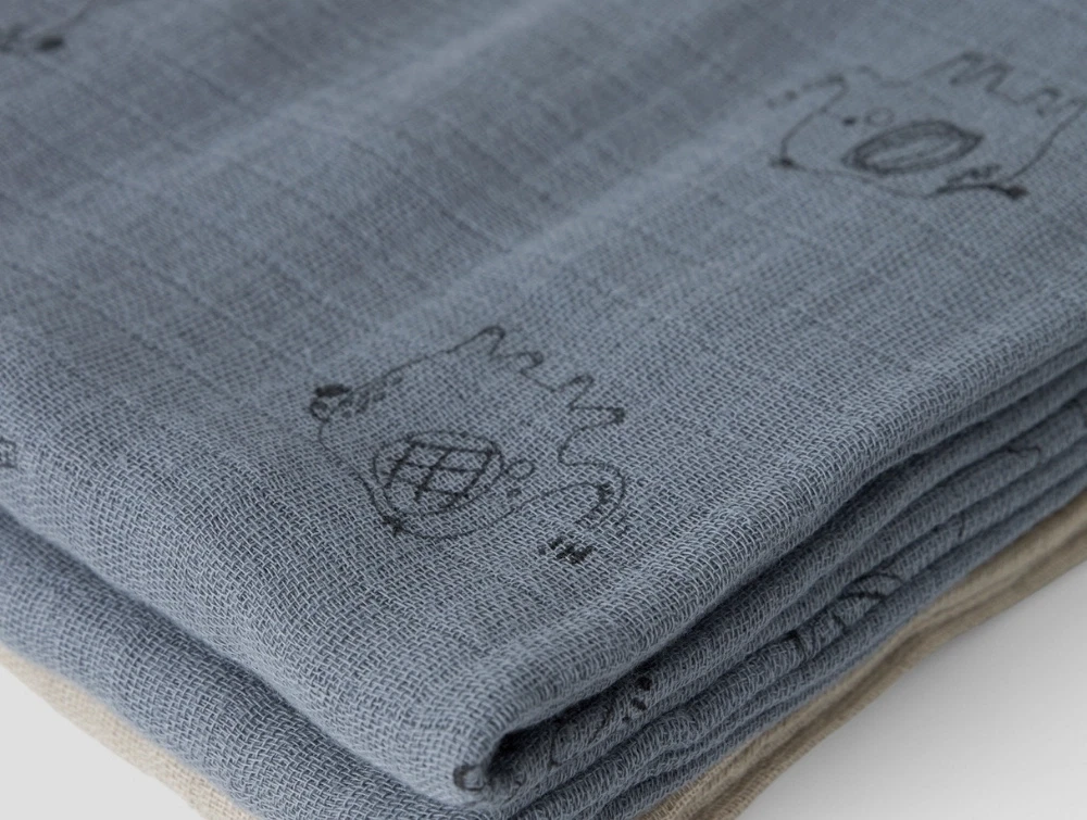 Bleerne er lavet af 100% økologisk bomuld i vævet kvalitet med let struktur, der gør dem ekstra bløde og absorberende. De kan bruges til mange formål som gylpeklud, hagesmæk, pusleunderlag eller let tæppe.