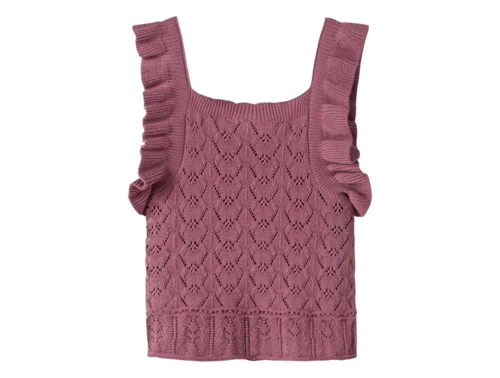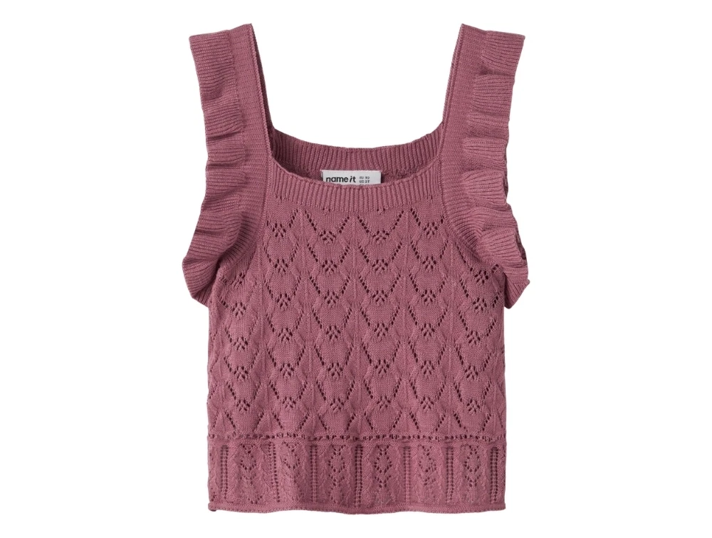 Striktop i rosa nuance (mesa rose) fra Name It med fint hulmønster og flæsedetaljer ved skuldrene.