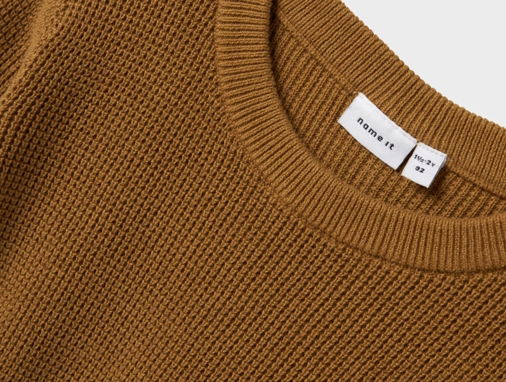 Name It striktrøje i gylden brun nuance med strukturstrik og rund halsName It striktrøje i gylden brun nuance med strukturstrik og rund hals