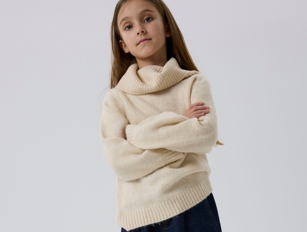 Pige iført Name It striktrøje beige med høj kraveName It striktrøje beige med høj krave forsideName It striktrøje beige med høj krave detaljeName It striktrøje beige med høj krave bagside