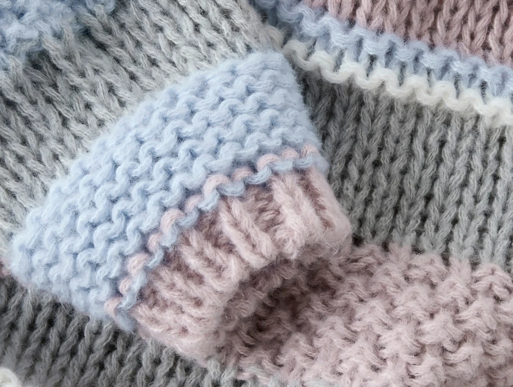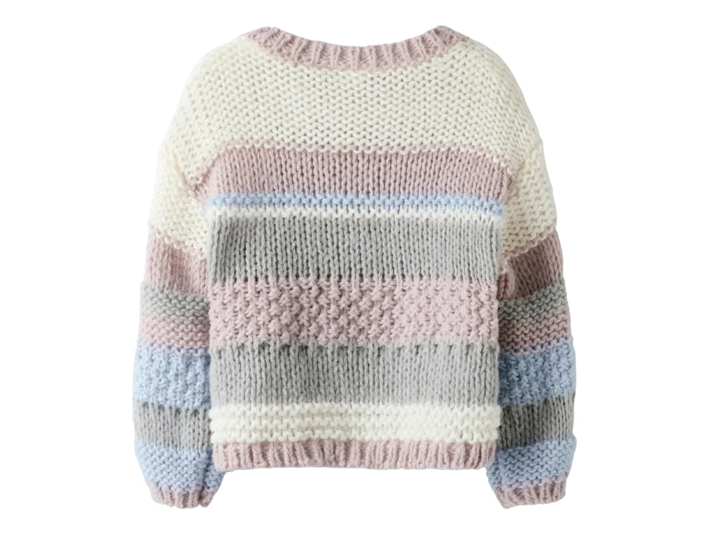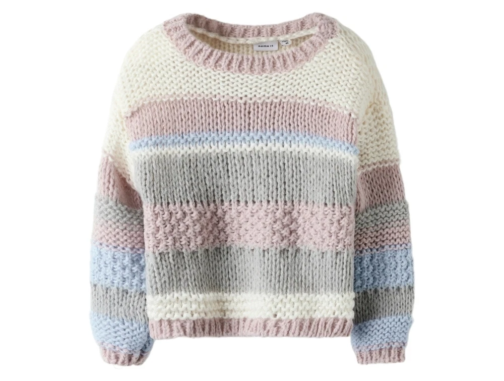 Striktrøje i lyseblå nuance (windsurfer) fra Name It med brede striber i rosa, grå og creme.