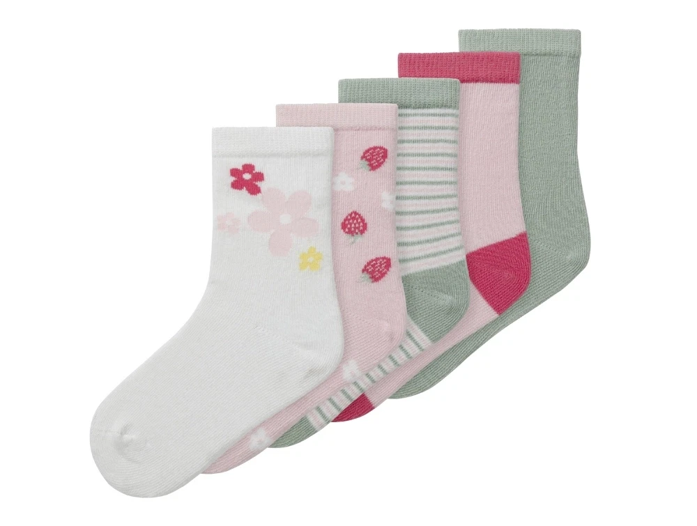 strømper fra Name It i lyse farver med blomster og jordbær5-pak Name It strømper med motiver i pink, grøn og hvid