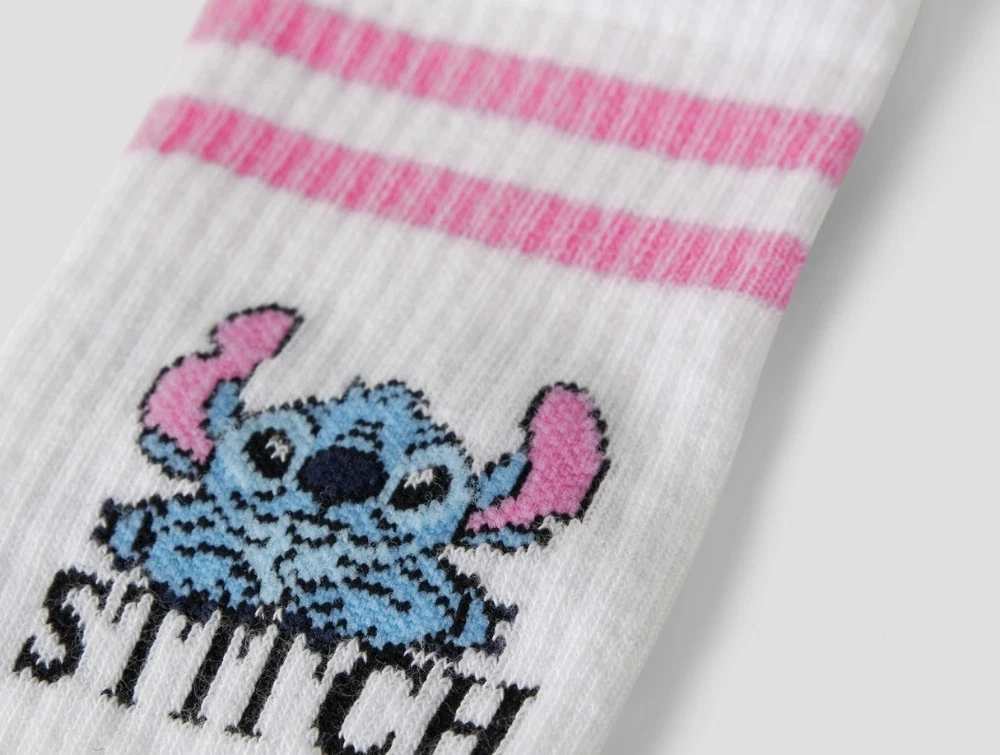 Designet har ribkant øverst med pink striber samt et motiv af Stitch fra Disney på anklen. Stitch er kendt som en lille blå figur med stor personlighed, der viser værdien af venskab og familie.