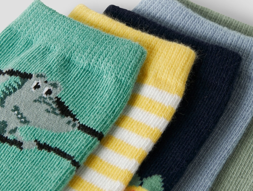 Name It strømper i grøn og gul med dino motiv 5-pakDetalje af bløde Name It strømper med dinosaurmotiv i 5-pak