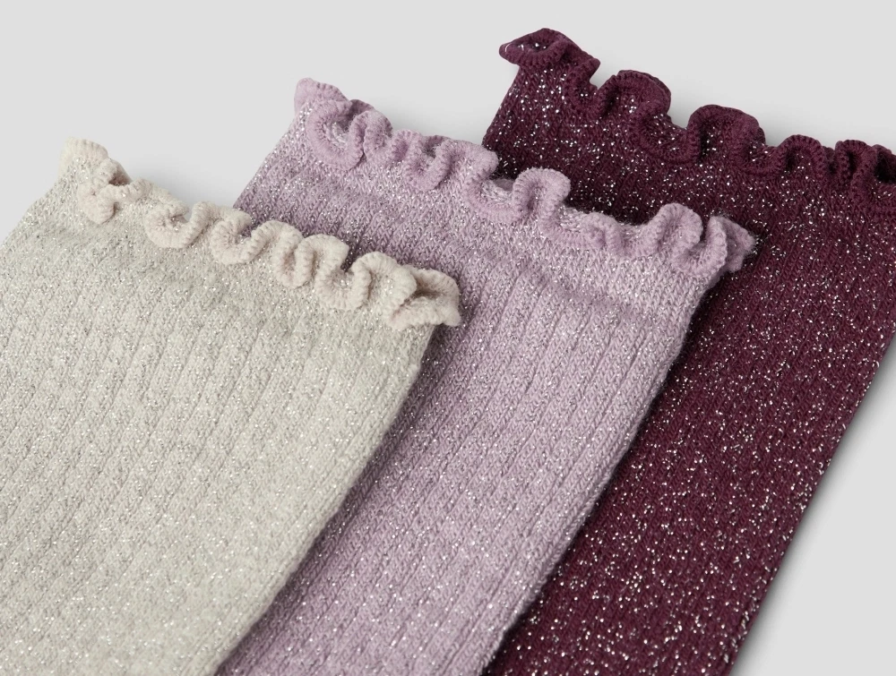 3-pak strømper fra Name It i lilla og beige nuancer med glimmerdetalje af strømper fra Name It med flæsekant og glimmer