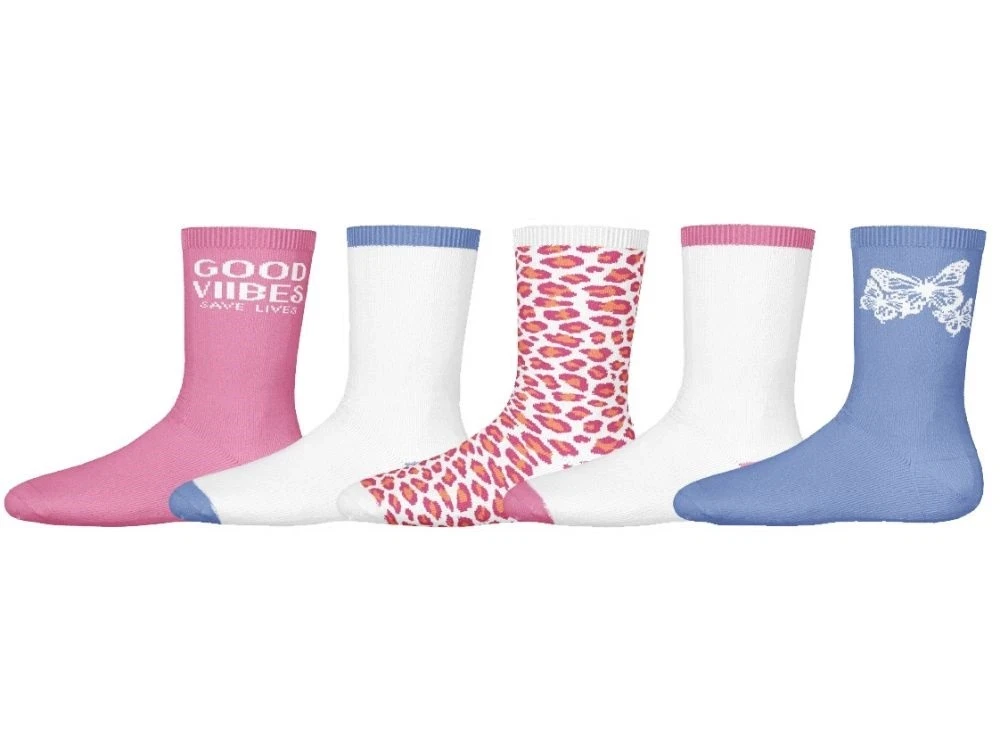 Denne pakke indeholder fem par bløde og behagelige strømper i forskellige nuancer af pink med fine mønstre og motiver. Strømperne har en god pasform og elastisk kant, der sikrer, at de bliver siddende på foden hele dagen.