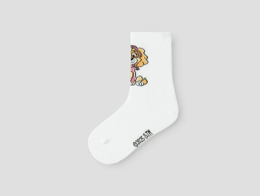 3-pak strømper fra Name It med Paw Patrol i hvid, lilla og rosaNærbillede af Paw Patrol motiver på 3-pak strømper fra Name ItHvid Paw Patrol strømpe med Skye fra 3-pak Name It strømper