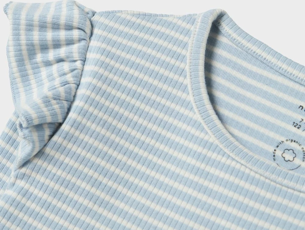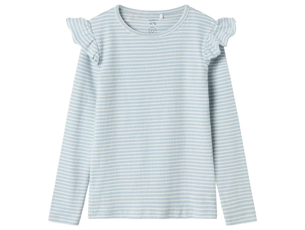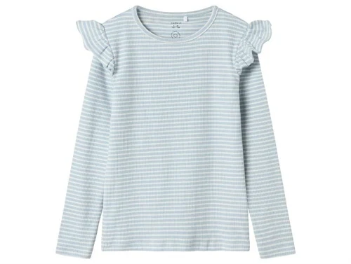 Top fra Name It med lyseblå striber og fine flæsedetaljer.