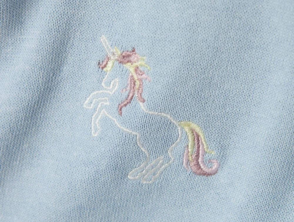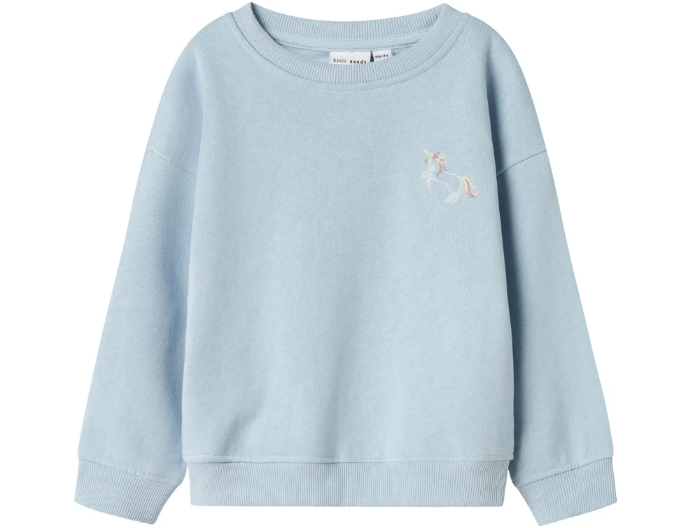Sweatbluse i farven subdued blue med lille enhjørningbroderi fra Name It.