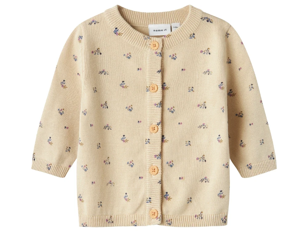 Cardigan til baby i farven summer sand med blomsterprint fra Name It.