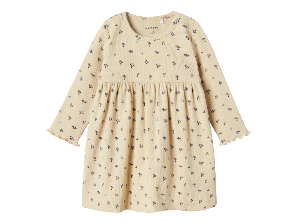 Kjole i farven summer sand med blomsterprint fra Name It.